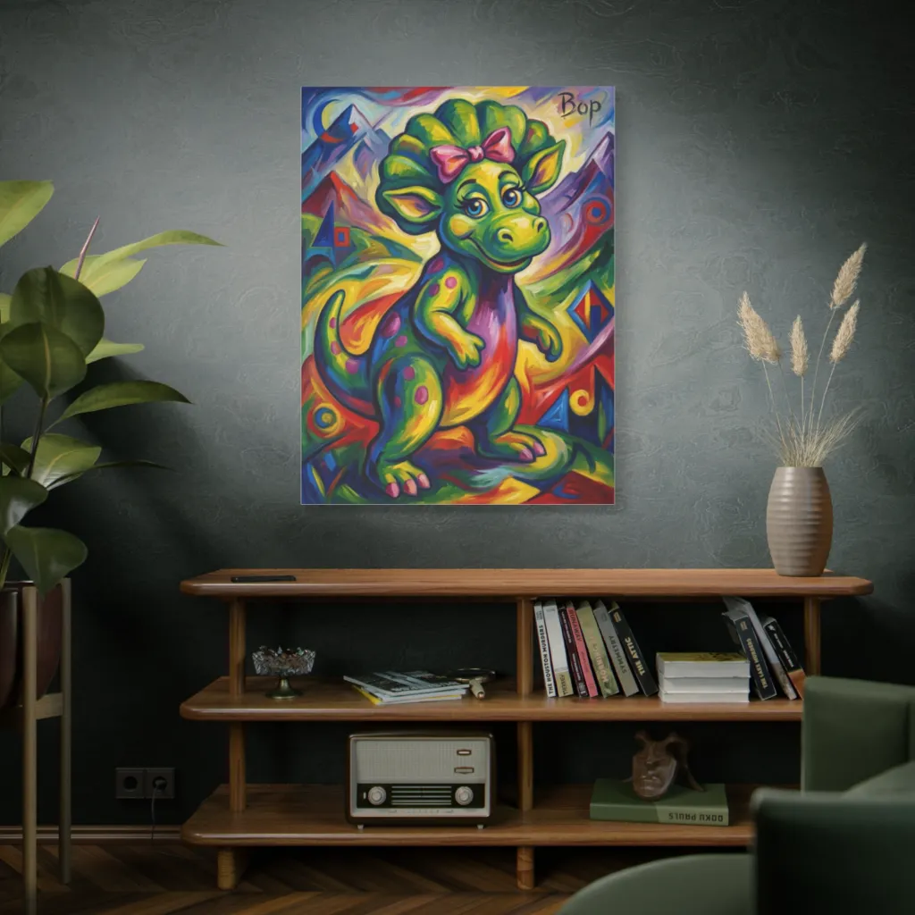 "Bop's Verdant Vision" commands attention with its playful cubist composition. The vibrant dinosaur possesses a compelling presence, akin to a lost Picasso study, making it an excellent candidate for a discerning modern exhibition.