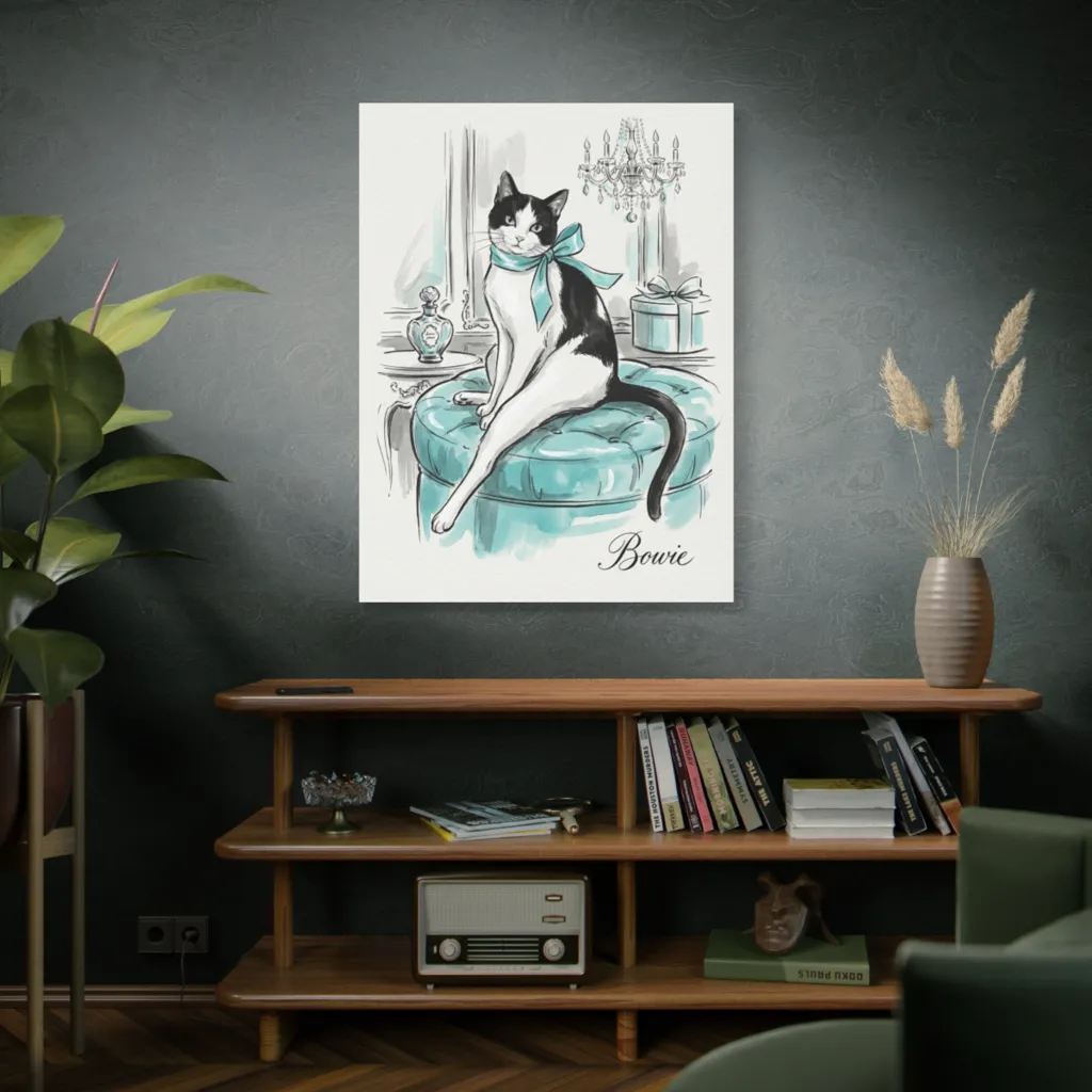 This dapper feline, Bowie, channels a stylish rockstar vibe, posing perfectly in his Tiffany-blue boudoir.