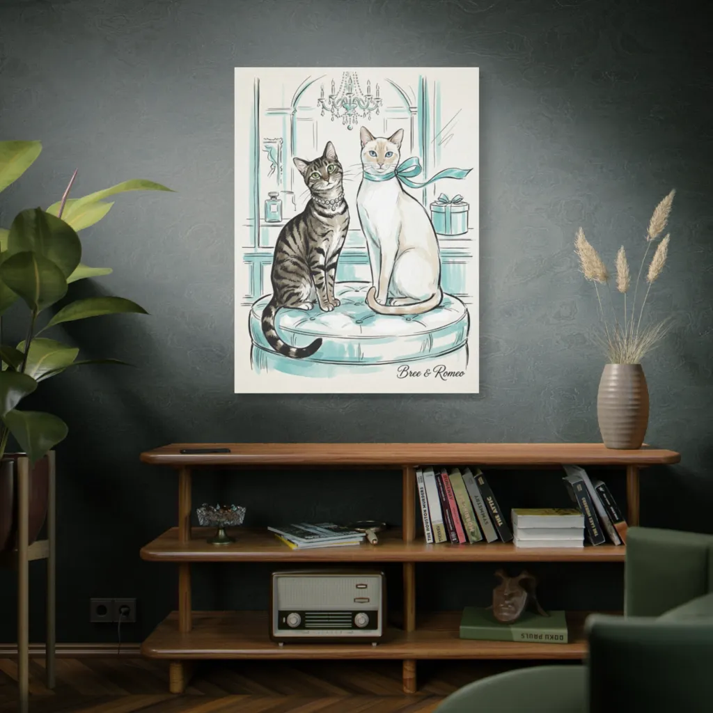 This charming watercolor and ink piece depicts two elegant cats, one in pearls, one with a ribbon, exuding whimsical, high-society allure in a Tiffany-esque setting. Bree flaunts her pearls while Romeo sports a dashing ribbon, both cat-ivatingly chic in their Tiffany-esque domain.