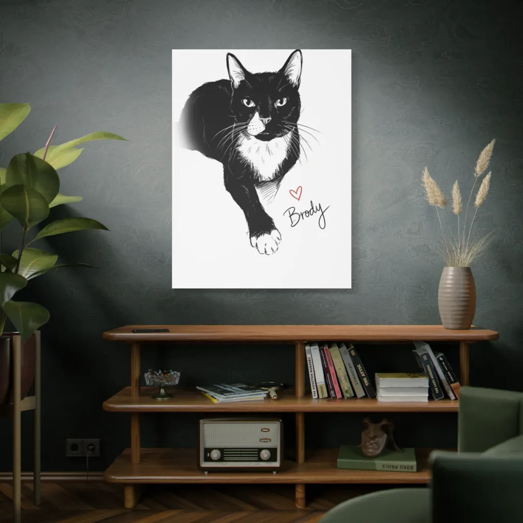 Brody's intense watchfulness and extended paw perfectly capture his dapper, royal personality. This minimalist portrait brilliantly reveals his contemplative yet demanding soul, making his unique character shine through. Truly empathetic.