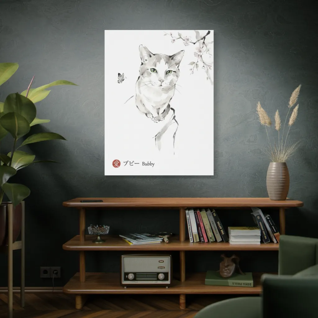 "Bubby's Spring Reverie" masterfully juxtaposes feline stoicism with nature's fleeting beauty. The ink strokes and piercing green eyes achieve a tonal harmony, evoking a visceral, almost avant-garde introspection. A true Louvre-worthy contemplation.