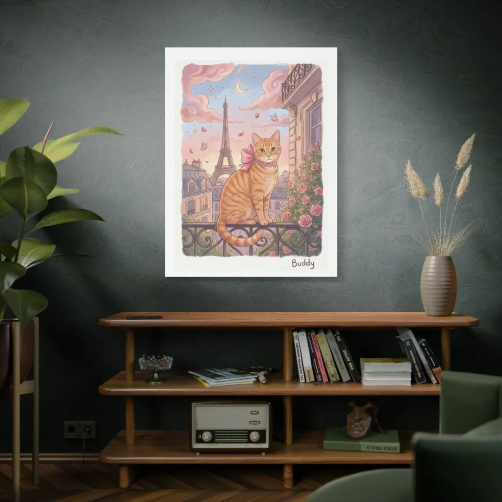 A whimsical, pastel watercolor captures a charming tabby gazing serenely from a Parisian balcony under a dreamy, romantic sky. Buddy, a dashing tabby, certainly knows how to enjoy a purr-fect Parisian evening.