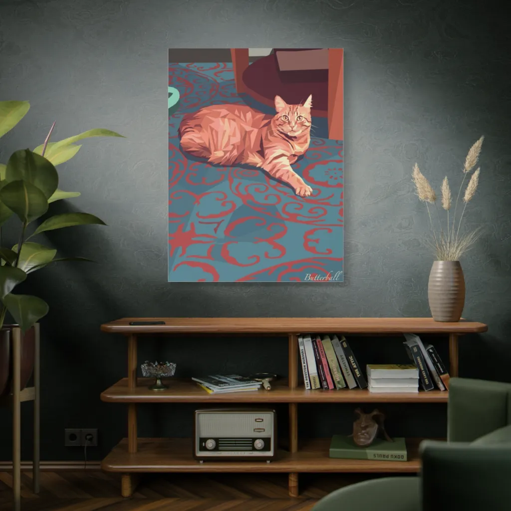 Butterball's relaxed, polygonal pose on his vibrant rug beautifully captures his serene, comfort-loving soul. His unique tabby markings and tranquil expression reveal a truly special, contented companion. A delightful portrayal of character.