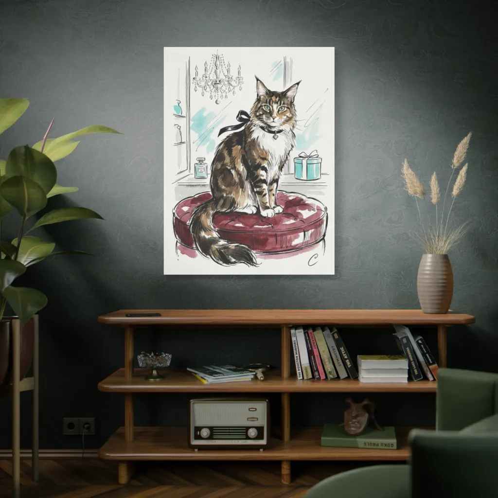 A charmingly confident Maine Coon, elegantly rendered in ink and watercolor, presides with casual luxury from its plush, tufted throne.