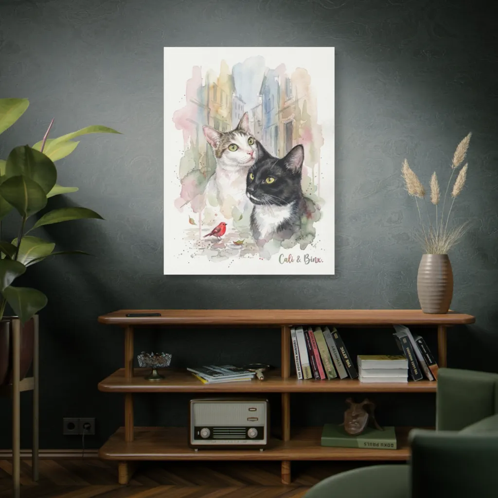Soft watercolors depict two watchful cats and a cheeky bird on a pastel street, radiating whimsical charm and curious warmth.