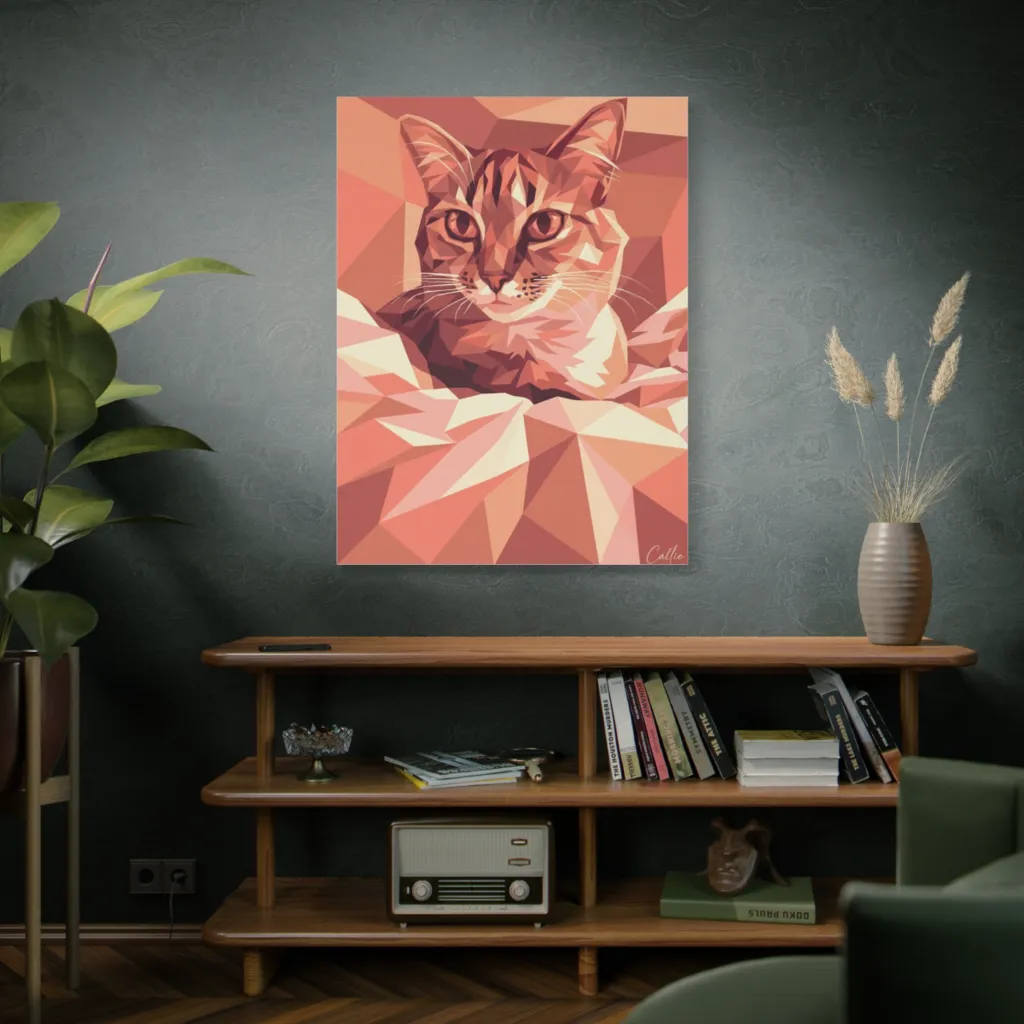 Geometric facets depict a warm, watchful cat, creating a striking yet cozy low-poly portrait. Callie proves even a faceted feline can be utterly captivating, ready to pounce on your heart.