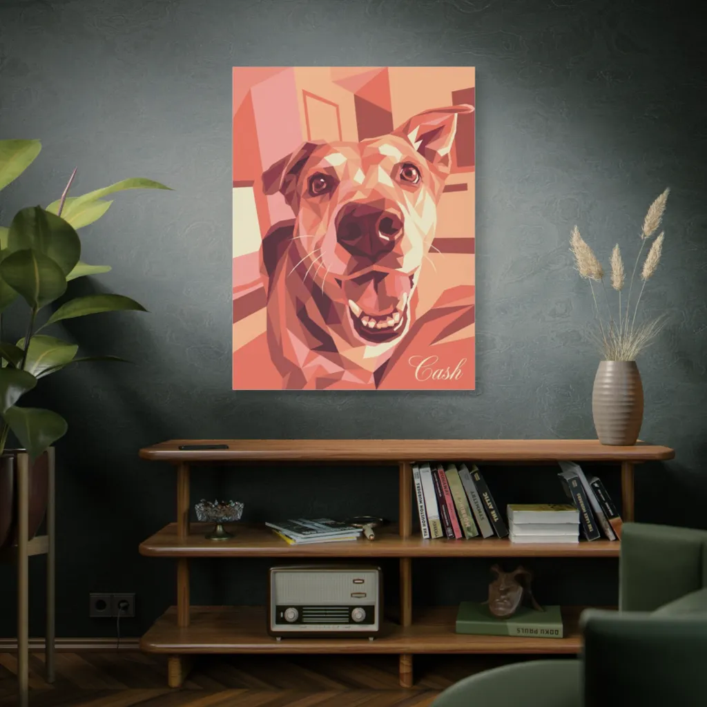 Warm, low-poly shapes create a jubilant canine portrait, radiating pure, fragmented doggy delight.