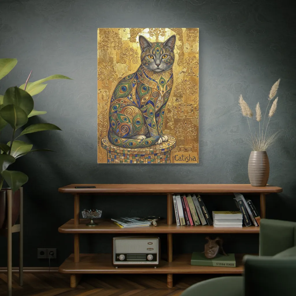 Catisha, a mosaic masterpiece, truly understands the art of looking purr-fectly opulent in her golden, peacock-emblazoned realm.