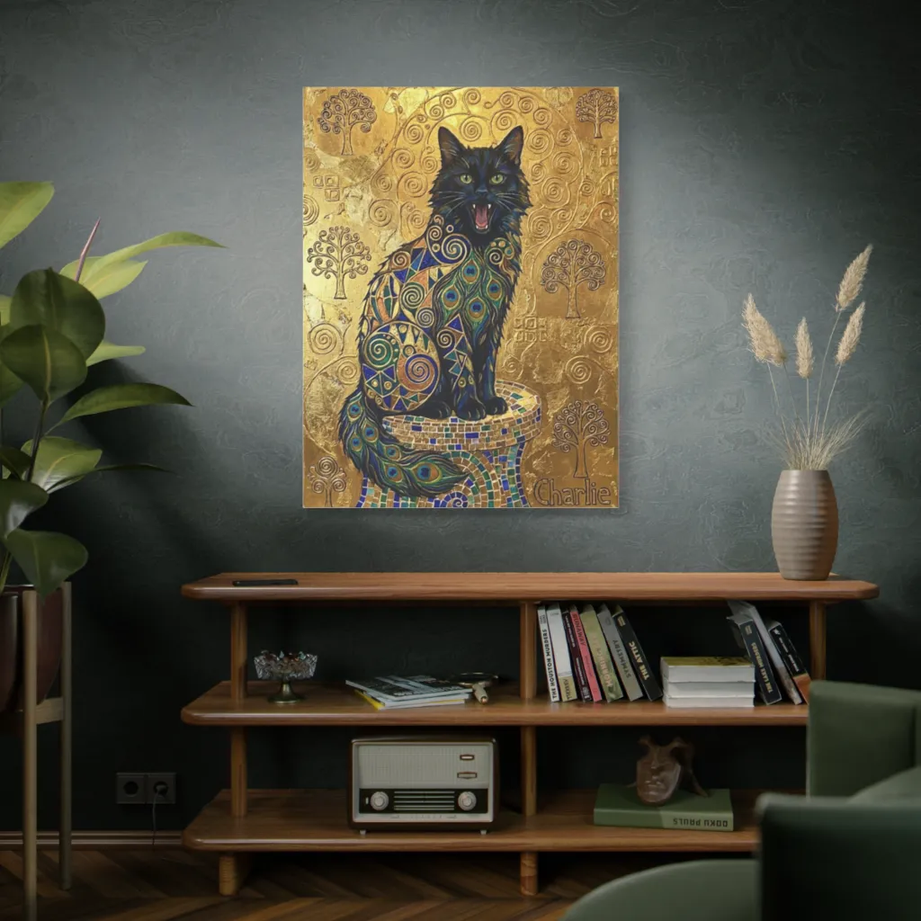The visceral juxtaposition of gilded geometry and roaring feline avant-garde demands reverence. Klimt's ghost, manifest in Charlie's formidable presence, achieves an unparalleled tonal harmony. A masterwork, truly.