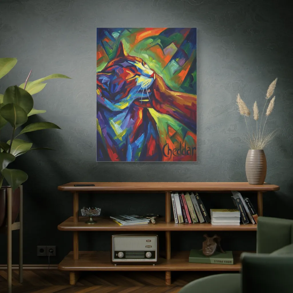 Our vibrant, cubist cat, Cheddar, looks ready to pounce, fueled by pure, abstract joy and perhaps a cheesy treat.