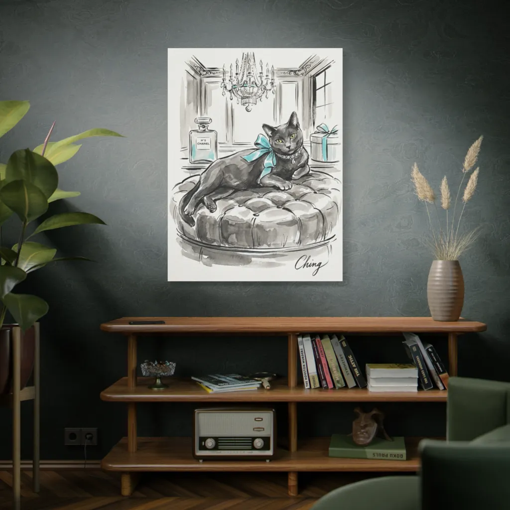 This chic ink and watercolor sketch captures a glamorous grey cat lounging amidst luxury, exuding a playful yet opulent mood. Ching clearly imagined this feline as the purr-fect jewel of high society.