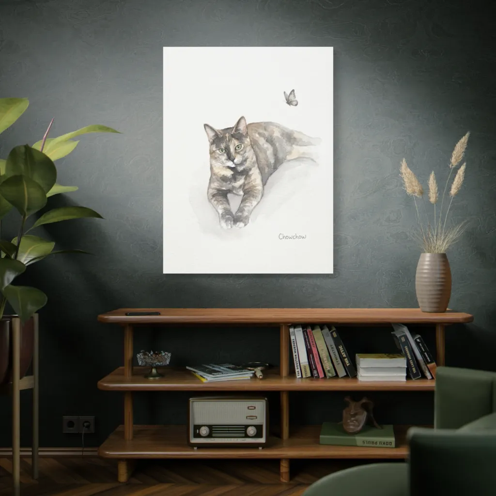A watercolor whisper of a tortoiseshell cat, all serene green eyes and gentle curiosity, gazes at a fleeting butterfly. Chowchow, with those emerald eyes, patiently considers whether that butterfly is a friend or foe.
