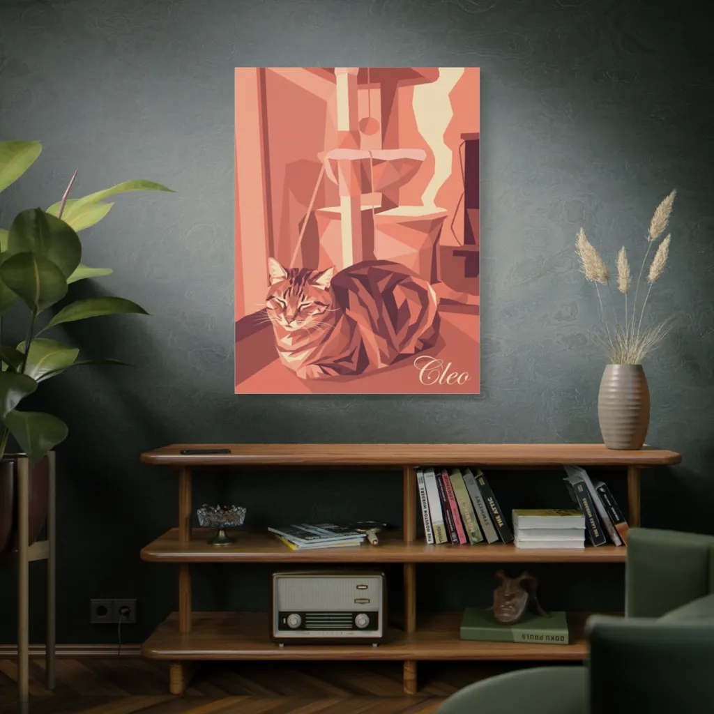 This piece brilliantly merges traditional feline portraiture with cutting-edge low-poly aesthetics. The cubist interpretation of Cleo's repose is bold, innovative, and a stunning digital-meets-classic blend.