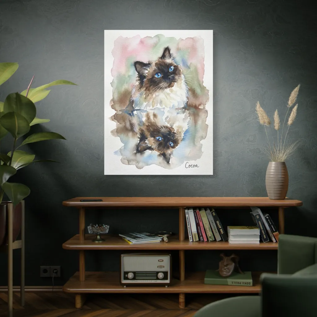 Loose watercolors render a mesmerizing blue-eyed cat, gazing curiously into its dreamy reflection with tranquil elegance.