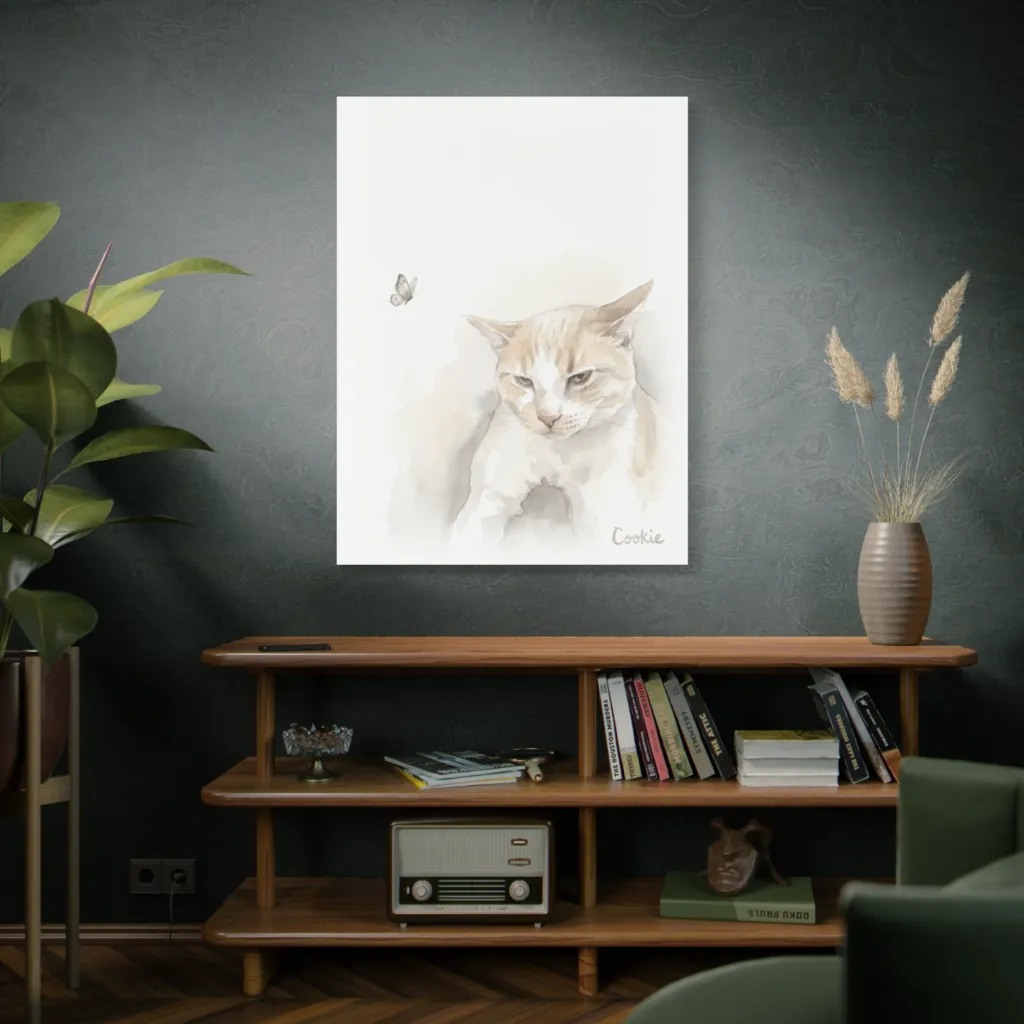 Soft, expressive watercolors immortalize a feline's comically grumpy standoff with a delicate, flitting butterfly.