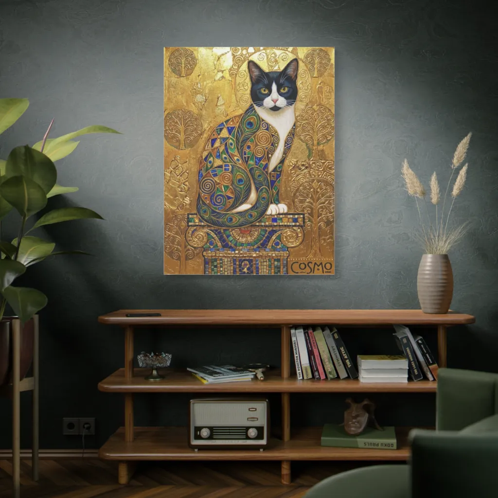 "Cosmo, Golden Sentinel" presents a masterful juxtaposition of gilded geometry and feline grace. Its Art Nouveau palette creates a visceral, almost sacred, presence. Truly, a compelling, purr-fectly executed study in modern idolatry.