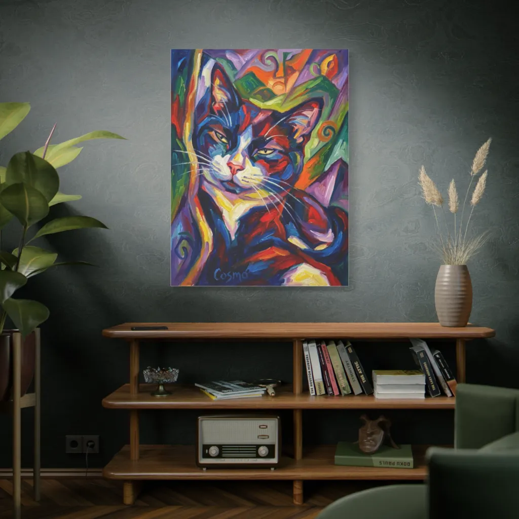 This piece is pure vibrant joy! Cosmo's playful gaze fills a room with confident warmth and delightful energy. Daily, it would inspire sassiness and a wonderfully bold, purr-fectly happy spirit.