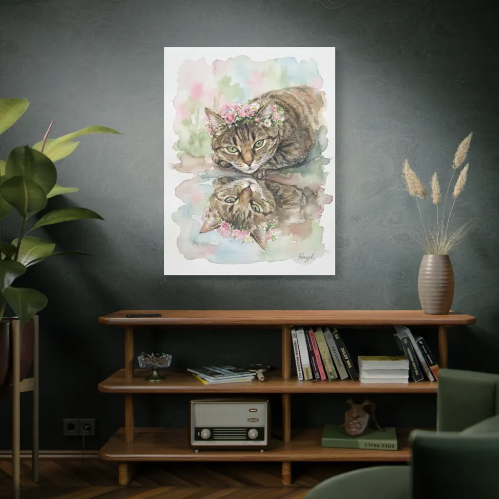 Dreamy watercolors capture a serene, flower-crowned tabby contemplating its soft reflection, radiating whimsical tranquility. Hazel makes a strong case for cats wearing tiaras, even when upside down.