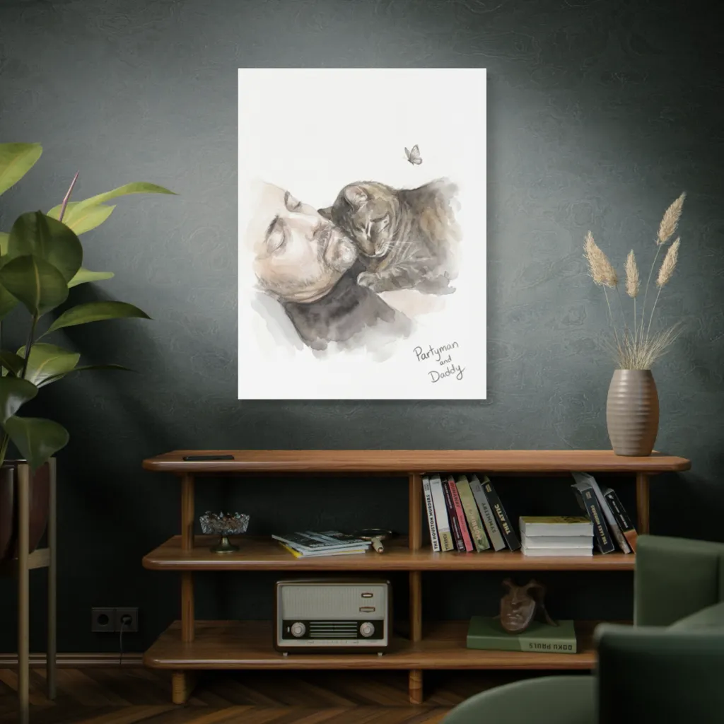 This piece offers a commanding presence, its tender composition reminiscent of Dutch Golden Age domesticity. The subtle watercolor technique elevates "Daddy's Partyman Reverie" to an exhibition-worthy status. A quiet masterpiece.