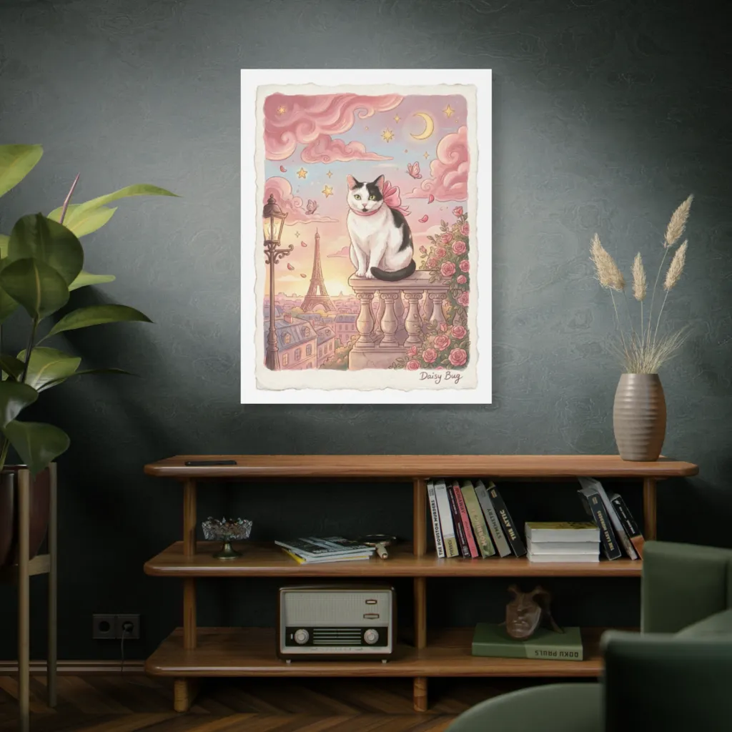 Soft watercolor renders a regal cat presiding over a dreamy, pastel Paris, a purr-fectly romantic and whimsical scene.
