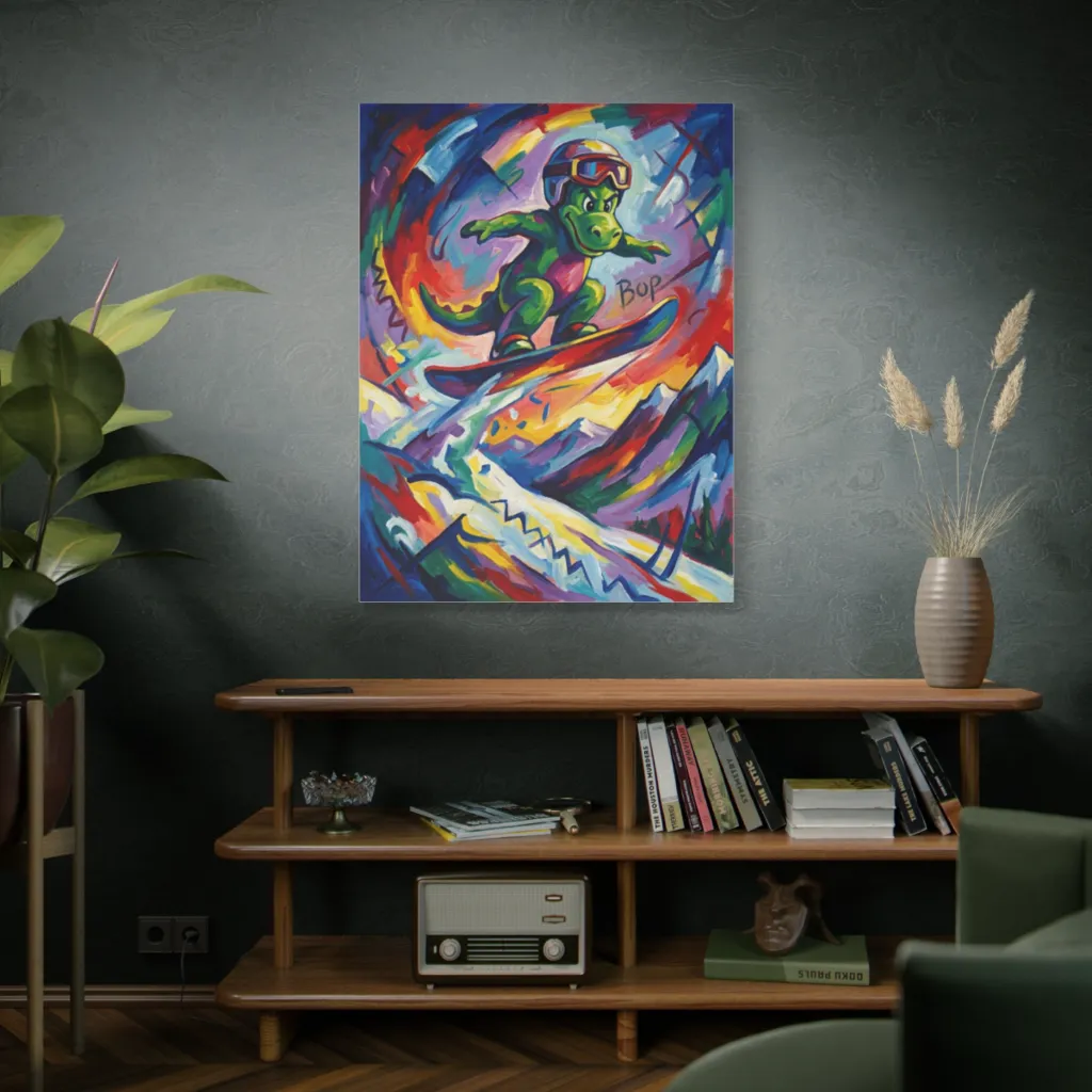 "Descent of Bop" presents a visceral juxtaposition of prehistoric glee and kaleidoscopic brushwork. The geometric dynamism and vibrant tonal harmony elevate this avant-garde spectacle. It's almost... Louvre-worthy. Almost.