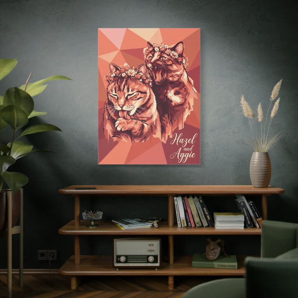 This vibrant geometric pop art captures two flower-crowned felines in a delightfully sassy and playful mood.