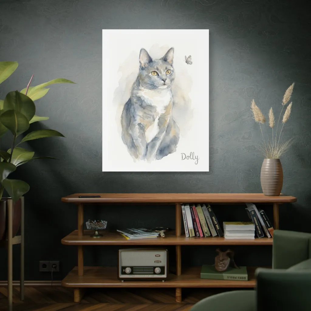 Soft watercolor washes beautifully capture a curious cat's gentle, watchful anticipation of a tiny, fluttering butterfly. Dolly, with those piercing amber eyes, is definitely wondering if that butterfly is more friend or fleeting snack.