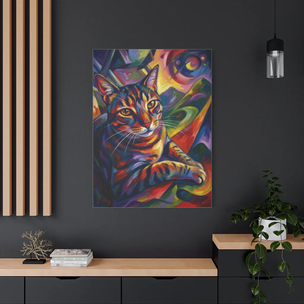 This fauvist-cubist piece masterfully blends traditional portraiture with a bold, digital aesthetic. Dolly’s Prismatic Gaze is an innovative, energetic exploration of contemporary feline artistry, pushing boundaries with abstract color.