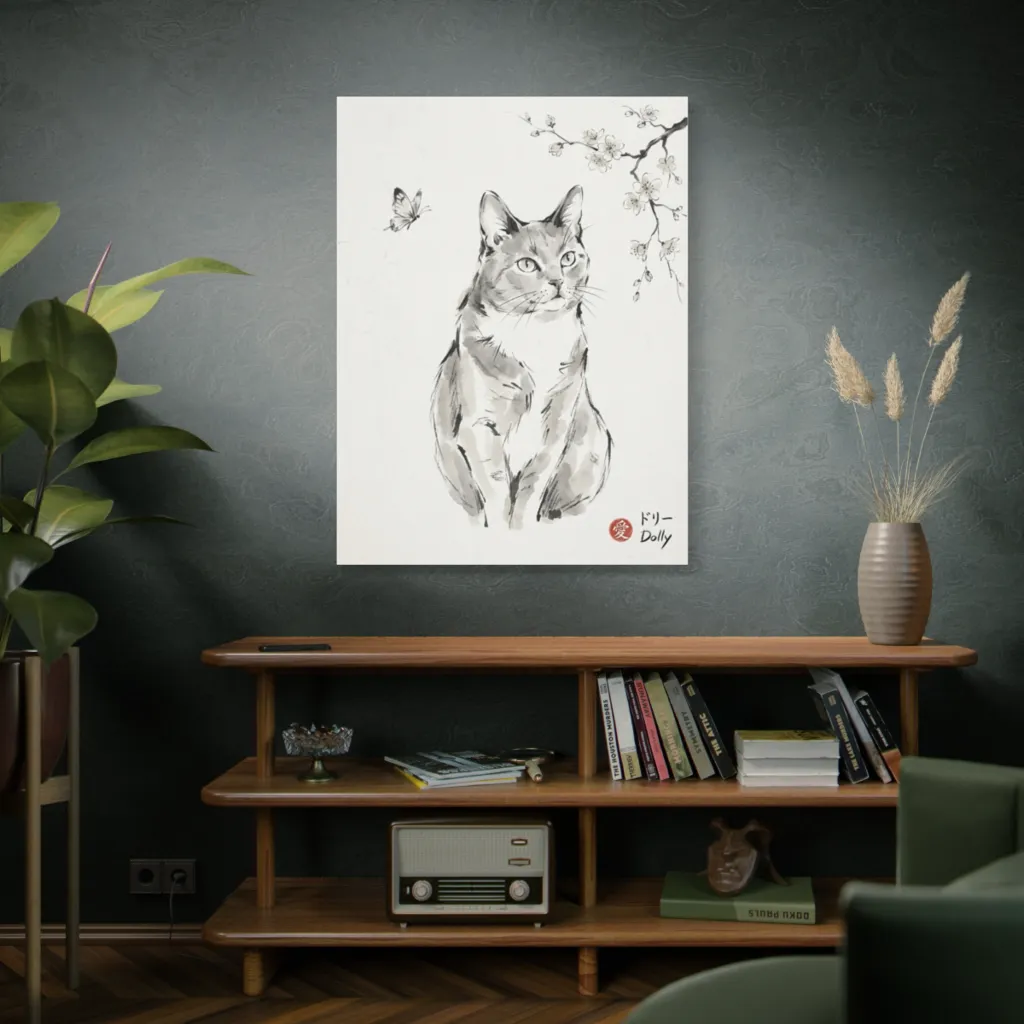 This sumi-e piece emanates a wonderfully serene and introspective mood. It's a tranquil, contemplative vibe, inviting peaceful reflection daily and bringing a heartwarming sense of quietude to any space.