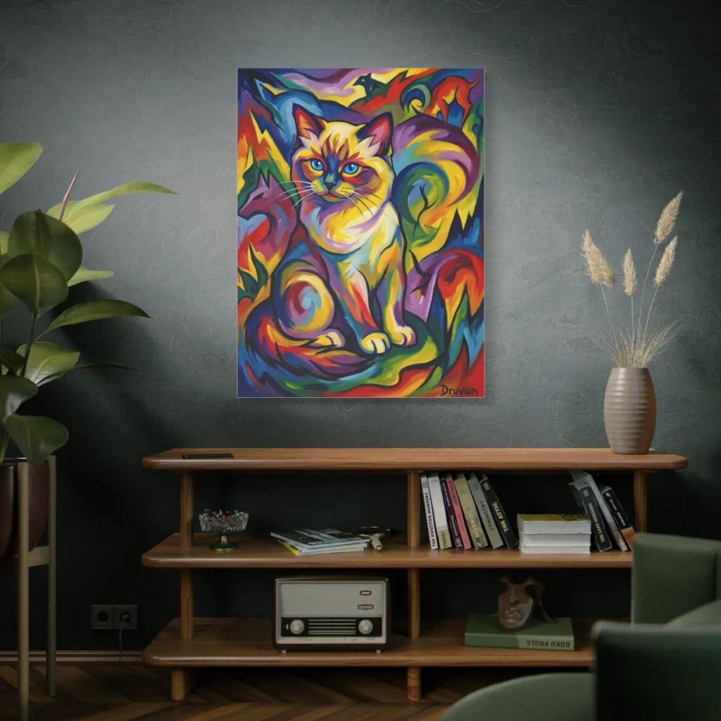 Druvan's azure gaze is a chromatic marvel! The electric blues resonate vibrantly against warm, swirling complements, creating exhilarating chromatic harmony. This masterful saturation beautifully captures the cat's playful, energetic character with brilliant emotional resonance.
