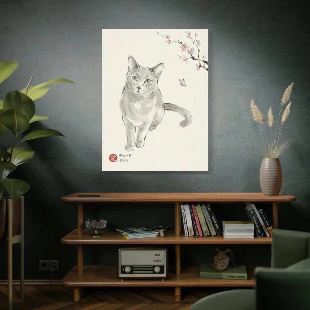 This digital sumi-e masterfully fuses traditional elegance with modern pet portraiture. Bold emerald eyes offer an innovative, captivating twist, pushing contemporary aesthetics with serene charm.