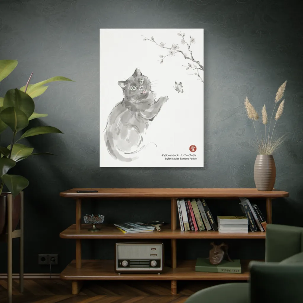 The sumi-e brushwork in "Dylan-Louise's Bamboo Whimsy" achieves a sublime tonal harmony, exquisitely juxtaposing visceral joy with delicate form. Avant-garde, darling. A Louvre-level revelation of feline spirit.