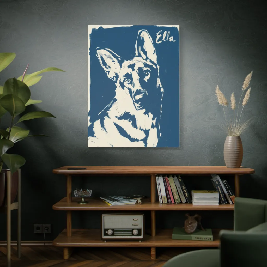A stark, graphic portrait captures an alert German Shepherd, distilling soulful loyalty into bold, two-tone strokes. Ella, rendered in striking blue and cream, is clearly all ears, ready for adventure or a whispered treat.