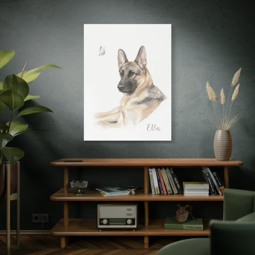 Delicate watercolors portray a vigilant German Shepherd's curious gaze upon a whimsical butterfly, creating a moment of poised, gentle wonder.