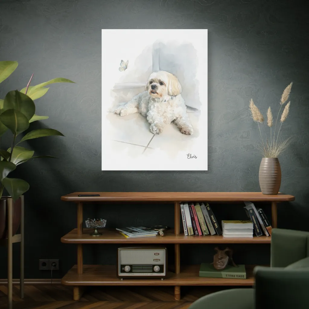 A soft watercolor captures a fluffy white dog's curious gaze at a butterfly, evoking tranquil charm.