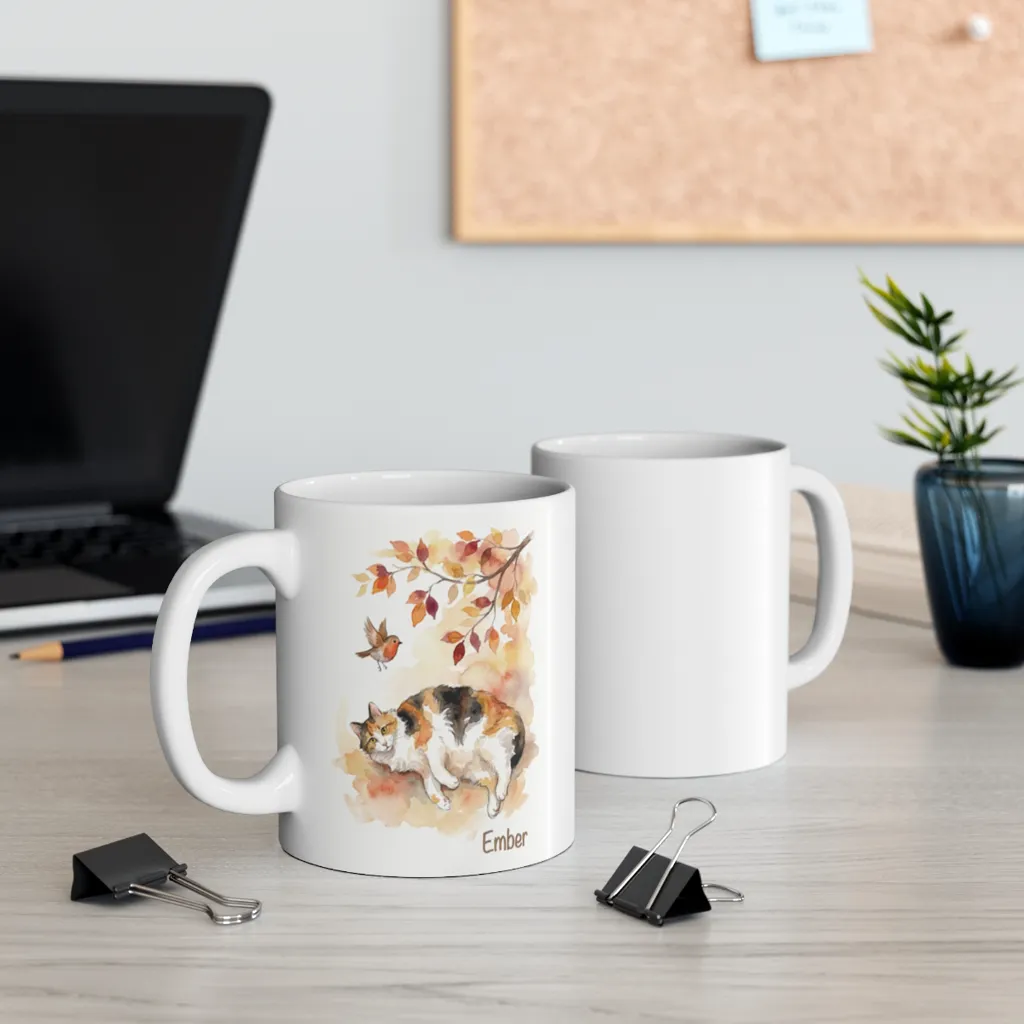 Charming watercolors depict a lounging calico cat's autumnal reverie, mischievously eyeing a brave little robin.
