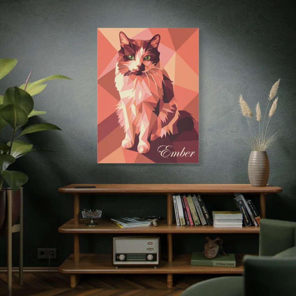 This witty, low-poly portrait captures a regal cat in warm, angular brilliance, its emerald gaze exuding understated power. Ember, a sharp-angled feline, stares down mere mortals, proving even in polygons, she's perfectly purr-fect.