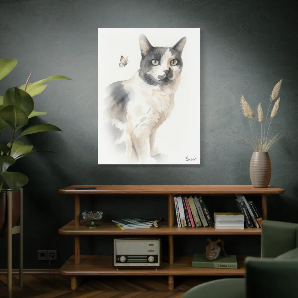 This ethereal watercolor captures a patched cat's curious gaze at a hovering butterfly, a moment of gentle, whimsical fascination. Ember's delicate strokes perfectly capture the kitty's ephemeral butterfly fascination.