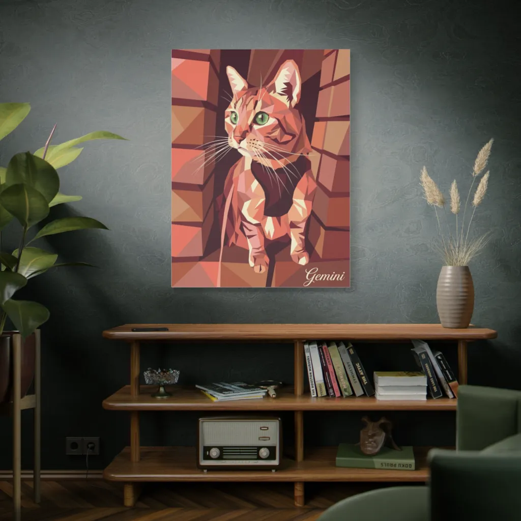 "Emerald Gaze of Gemini" brilliantly fuses traditional feline portraiture with bold, geometric pop-art. The polygonal form and keen emerald eyes are innovative, creating a dynamic, modern aesthetic that perfectly encapsulates Gemini's complex, digital-age personality. A striking contemporary piece!