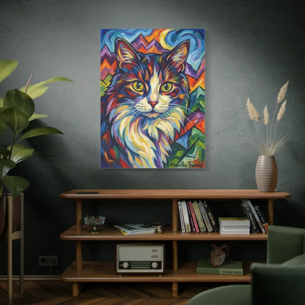 This vibrant, neo-expressionist cat portrait explodes with kaleidoscopic color and angular charm, radiating a playful yet watchful mood.