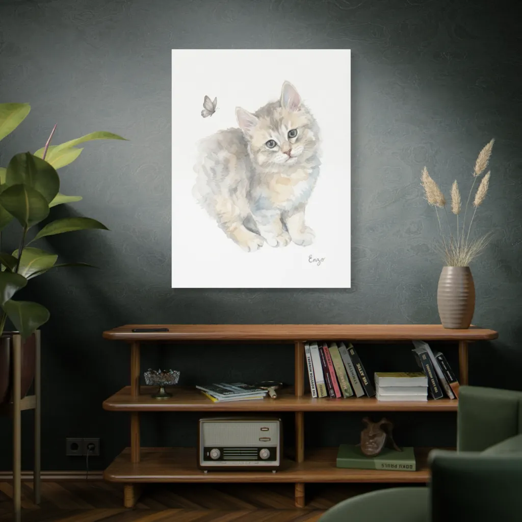 A soft watercolor wash captures a fluffy kitten's gentle curiosity towards a delicate butterfly, creating a charming, innocent mood. Enzo, clearly enchanted, renders pure feline wonder.