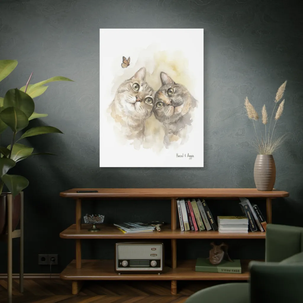 Whimsical watercolor portrays two wide-eyed felines, captivated by a butterfly, in an endearing moment of shared curiosity.