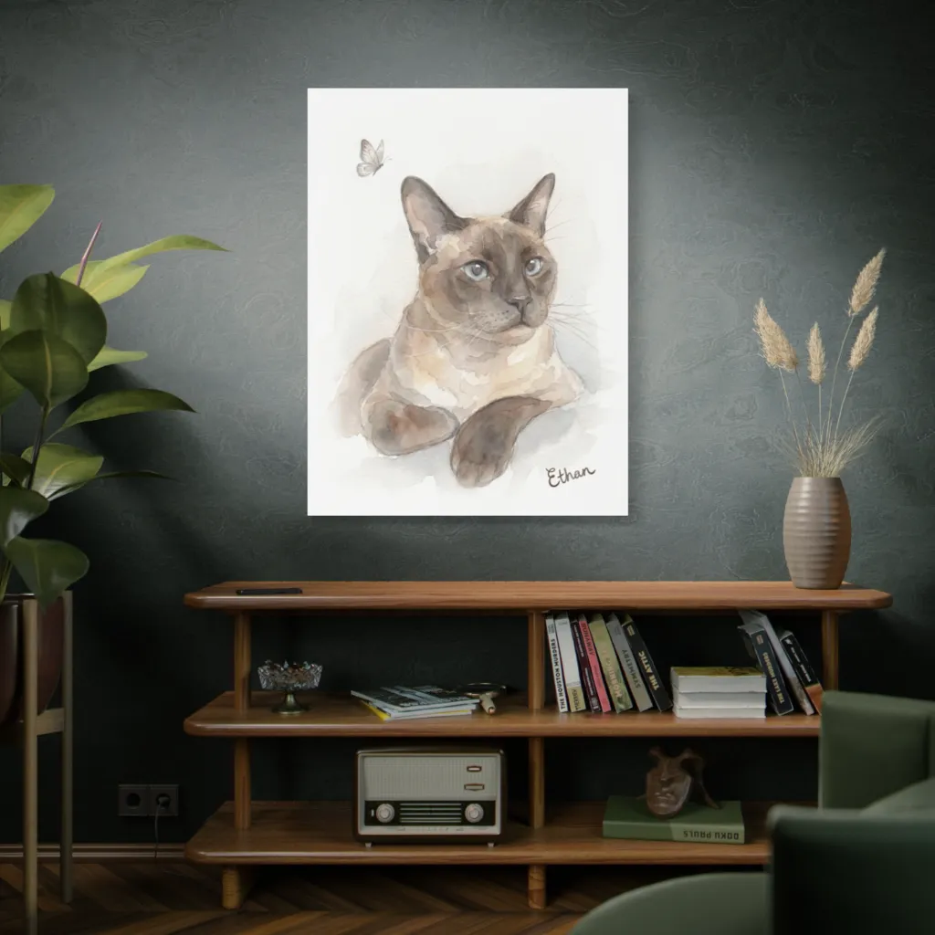 Ethan's gentle curiosity shines through his captivating butterfly gaze. This watercolor beautifully captures his Siamese connoisseur soul, revealing a unique blend of elegance and playful wonder. Truly special.