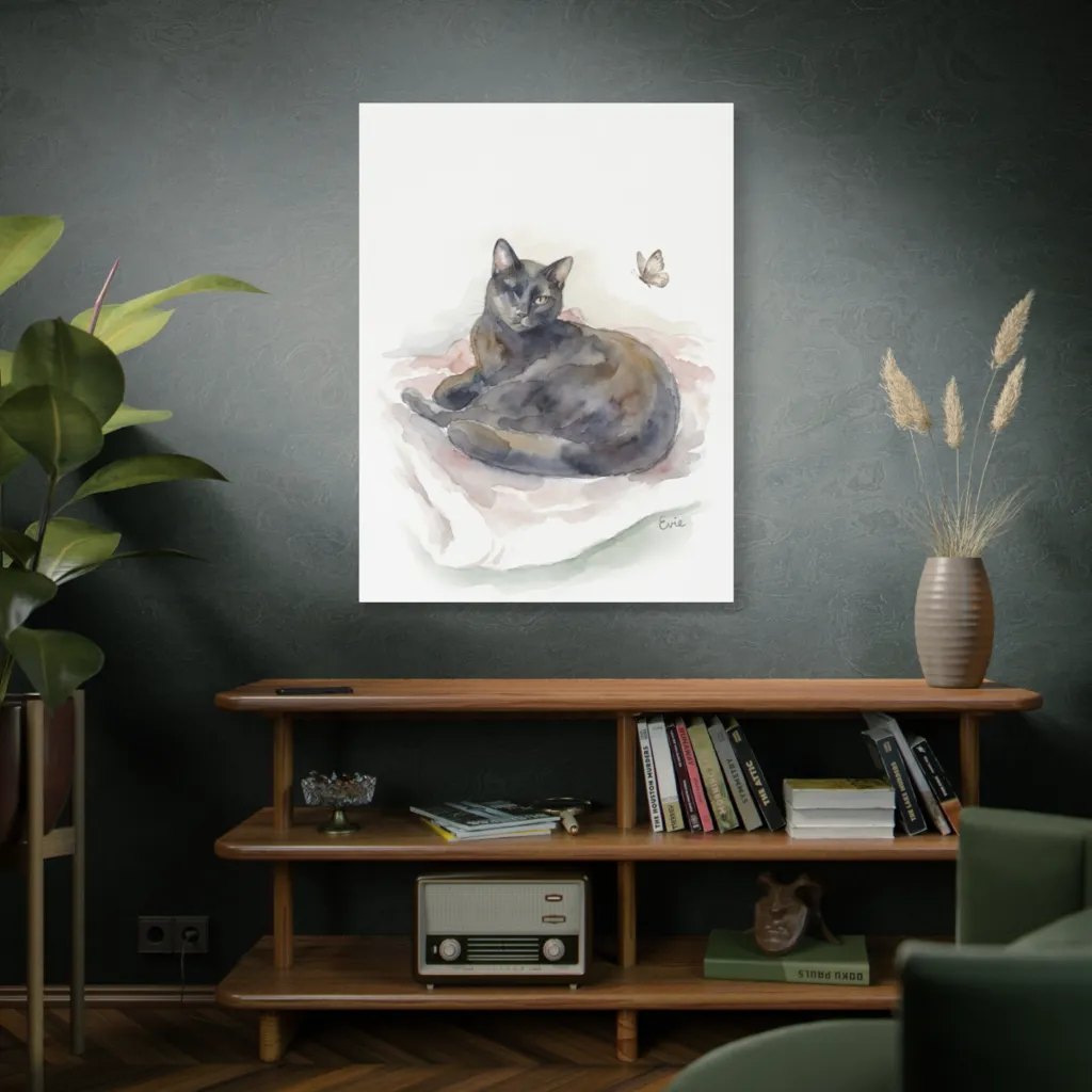 Loose watercolors capture a sleek cat's serene repose, subtly eyeing a butterfly in this charmingly tranquil moment.