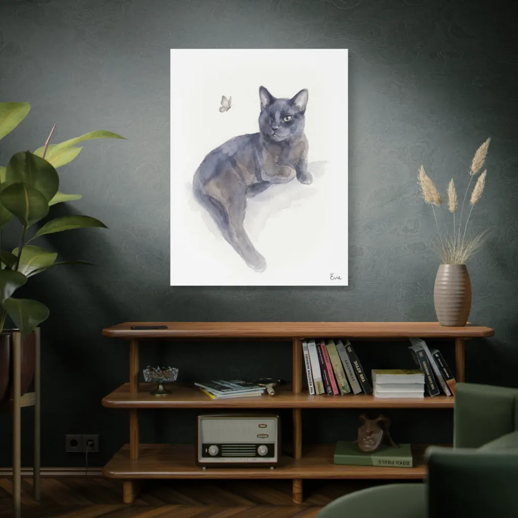 Soft watercolors capture a steely-eyed gray cat, mid-recline, observing a fleeting butterfly with charming, quiet intensity.
