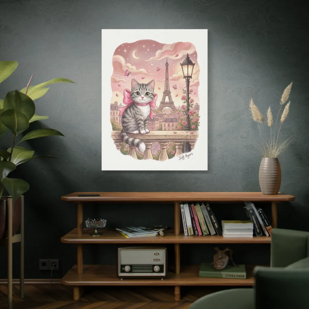 Jeff Ayers' sweet, pastel illustration presents a charming tabby, bow-clad, serenely enjoying a whimsical Parisian sunset, quite the cat-tivating dream.