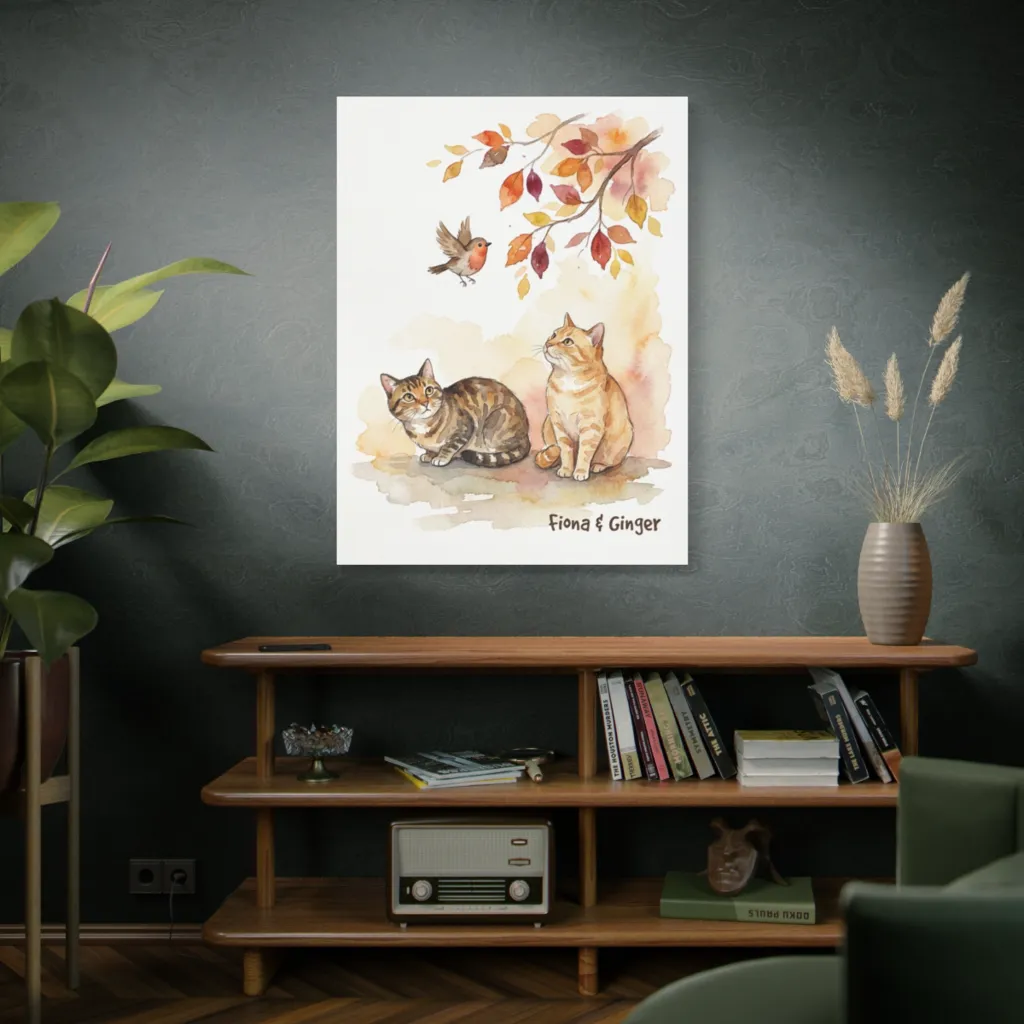 The autumnal palette beautifully balances warm oranges and cool robin blues. High saturation vibrantly captures Fiona and Ginger's focused energy, creating chromatic harmony. It's a purr-fectly resonant emotional statement.
