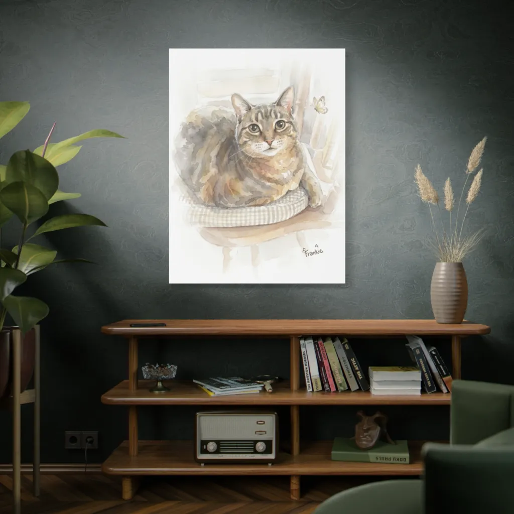 Loose watercolors depict a sweet tabby cat, plump and alert on a cushion, captivated by a whimsical butterfly. Frankie, perfectly plump and pastel, deems this charming butterfly encounter utterly purr-fect.