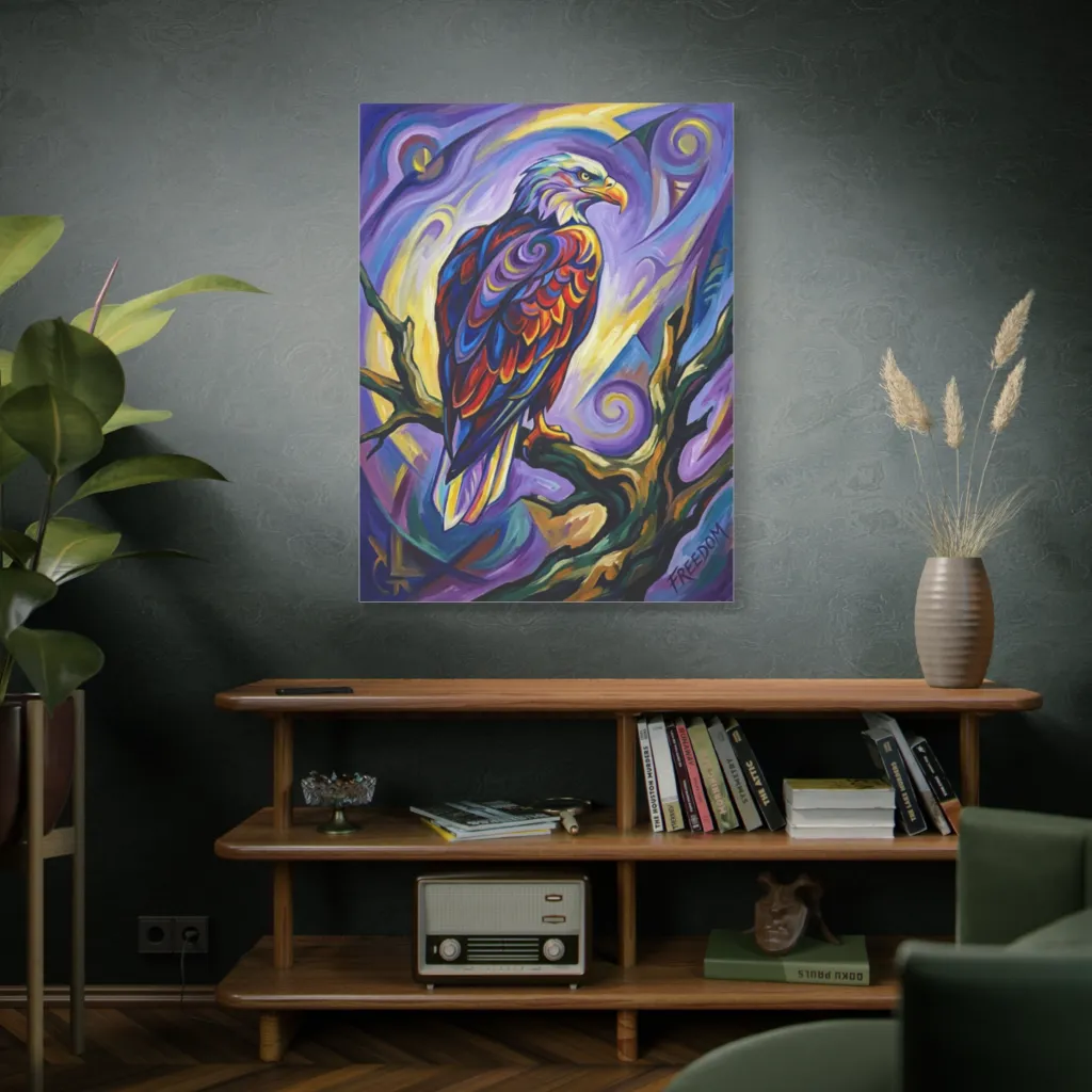 A kaleidoscopic eagle, perched amid swirling abstract hues, radiates an electrifying and majestic spirit. Painted with such spirited hues, this majestic eagle truly embodies the kaleidoscopic essence of Freedom.