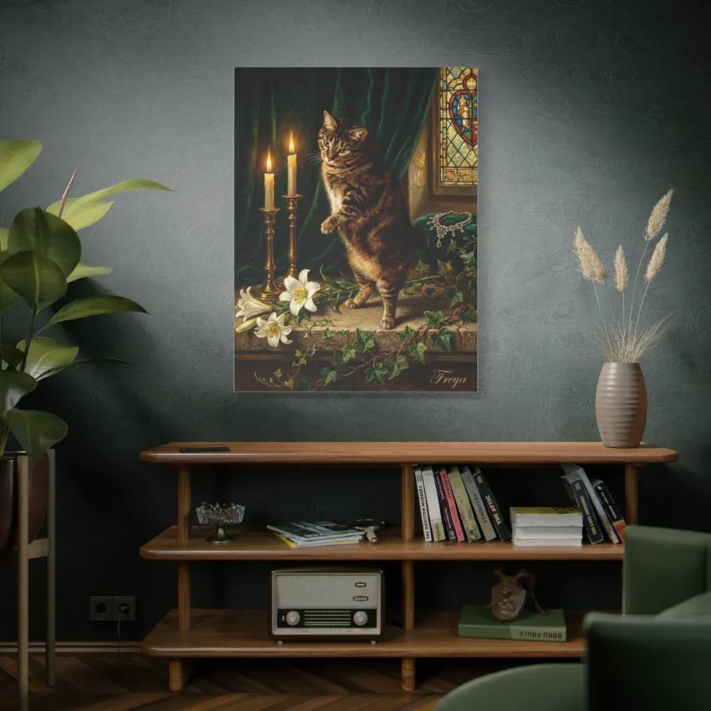 A regal tabby, caught mid-prowl by candlelight, injects mischievous charm into a richly detailed, classical setting.